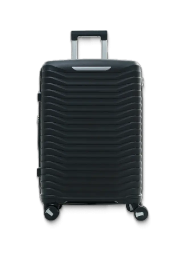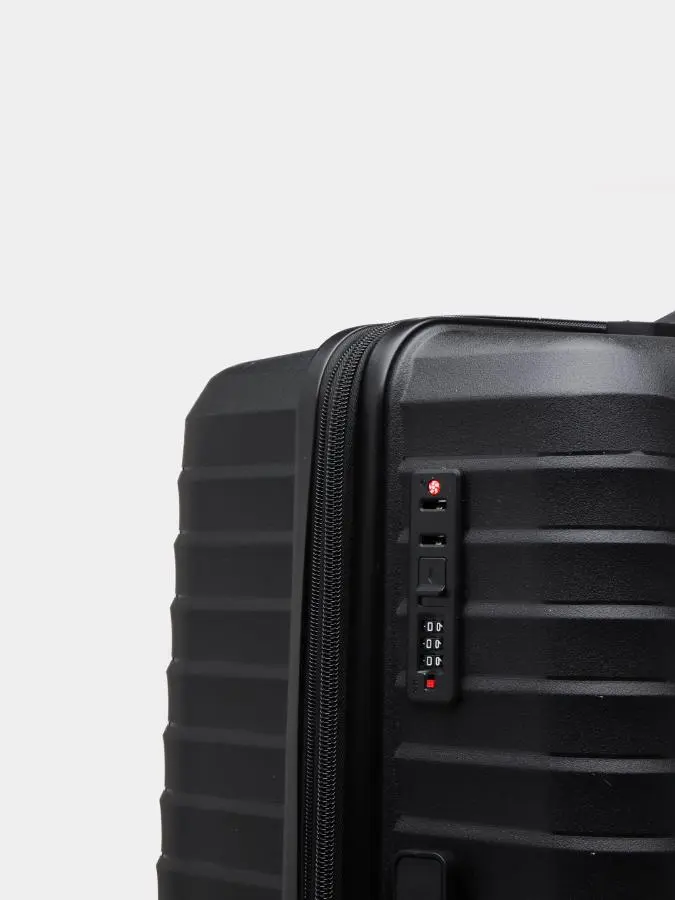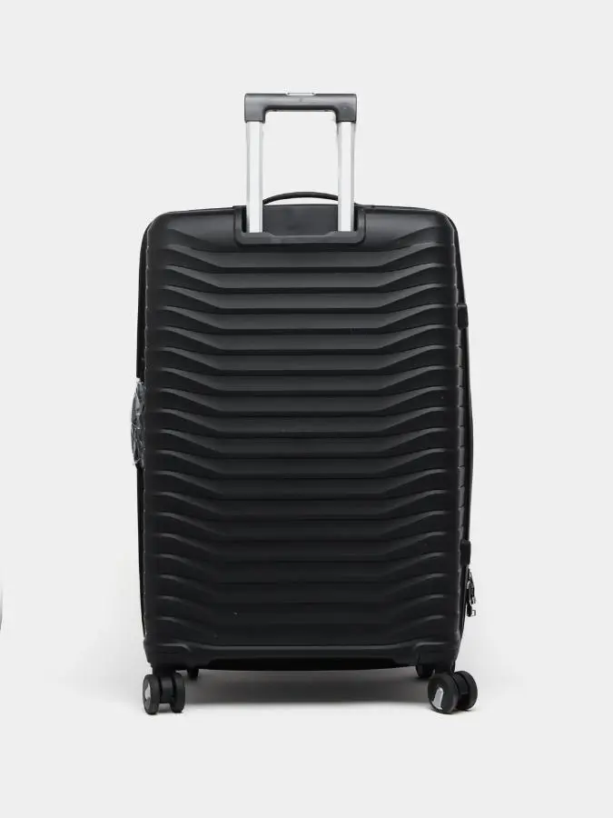 Стильный чемодан в спокойном черном цвете с лаконичным и оригинальным дизайном изготовлен из водонепроницаемого износостойкого полипропилена, что обеспечивает безопасность багажа и его содержимого. Классический нейтральный цвет чемодана подходит к любому стилю одежды, не выгорает на солнце и никогда не устареет из-за моды.Телескопическая выдвижная ручка фиксируется в двух положениях, благодаря чему ее можно настроить под рост любого человека. С помощью дополнительных ручек чемодан легко поднимать и переносить. Надежный колесный блок с легкостью выдержит большую нагрузку. А маневренные вращающиеся на 360 градусов колеса позволят легко перемещать багаж на вокзалах и в аэропортах, когда часто приходится изменять направление движения.